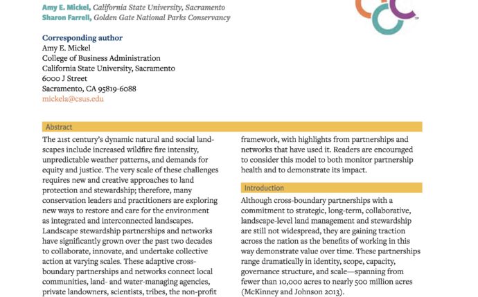 In this article the Partnerships Impact Model is introduced as a promising impact assessment framework. As the 21st century’s dynamic natural and social landscapes include increased wildfire intensity, unpredictable weather patterns, and demands for equity and justice. The scale of these challenges requires new and creative approaches to land protection and stewardship. However, there is a shortage of research-based frameworks to evaluate the impact of landscape stewardship partnerships practicing collaborative leadership.