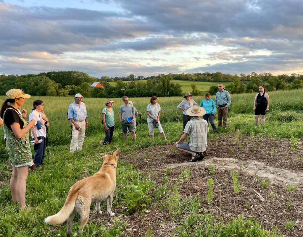 Partners within the Driftless Area Conservation Partnership, a 2023 Catalyst Fund grantee, convene for a tour of the Sugar Valley Farm in June 2024 to learn more about biodiverse nature-based farming practices. Photo by Brenna Holzhauer, Natural Resources Foundation of Wisconsin.